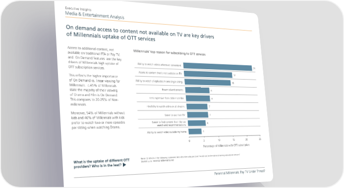 Executive Insights Media & Entertainment Analysis On demand access to content not available on TV are key drivers of Millennials uptake of OTT services Access to additional content, not Millennials’ top reason for subscribing to OTT services available on traditional FTA or Pay TV, and On Demand features are the key drivers of Millennials high uptake of Ability to watch videos whenever convenient 24 OTT subscription services. Access to content that is not available on TV 17 This reflects the higher importance of On Demand vs. linear viewing for Ability to watch all episodes in one single sitting 16 Millennials. c.45% of Millennials state the majority of their viewing Fewer advertisements 8 of Drama and Film is On Demand. Less expensive than cable / satellite 8 This compares to 20-25% of Non- millennials. Flexibility to watch video on all devices 7 Moreover, 54% of Millennials without Easier to use than TV 7 kids and 46% of Millennials with kids prefer to watch two or more episodes Easier to find content that I like via 6 per sitting when watching Drama. search and recommendations Ability to watch video outside my home 4 0 5 10 15 20 25 Percentage of Millennials with OTT subscription What is the uptake of different OTT Note: Q: Which of the following statements best describes why you [use / would use] online video streaming subscription services? Source: L.E.K. Perennial Millennial Survey providers? Who is in the lead? t Perennial Millennials: Pay TV Under Threat?
