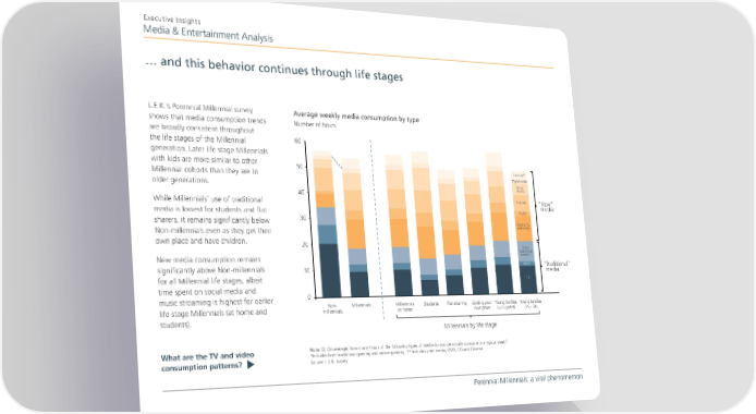 Executive Insights Media & Entertainment Analysis … and this behavior continues through life stages L.E.K.’s Perennial Millennial survey Average weekly media consumption by type shows that media consumption trends Number of hours are broadly consistent throughout the life stages of the Millennial 60 - generation. Later life stage Millennials with kids are more similar to other 50 - Millennial cohorts than they are to Gaming* Digital media Social older generations. media 40 - While Millennials’ use of traditional Internet “New” media media is lowest for students and flat Music sharers, it remains significantly below 30 - Online TV Non-millennials even as they get their and video own place and have children. 20 - Other traditional New media consumption remains media** significantly above Non-millennials 10 - Radio “Traditional” media for all Millennial life stages, albeit TV time spent on social media and music streaming is highest for earlier 0 Non- Millennials Millennials Young families Young families life stage Millennials (at home and Students Flat sharing Getting your millennials at home own place (<25 years) (25 - 34) students). Millennials by life stage What are the TV and video Note: Q: On average, how many hours of the following types of media do you personally consume in a typical week? *Includes both traditional gaming and online gaming. ** Includes print media, DVD, CD and Cinema Source: L.E.K. survey consumption patterns? t Perennial Millennials: a viral phenomemon