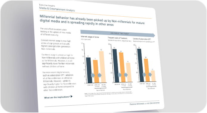 Executive Insights Media & Entertainment Analysis Millennial behavior has already been picked up by Non-millennials for mature digital media and is spreading rapidly in other areas The viral effect is evident when Less mature “new media” looking at the uptake of new media of different maturity. Internet usage at home Frequent users of Facebook Uptake of subscription OTT Hours per week Percent of respondents using at least daily Percent of respondents subscribing to OTT General internet usage is now high across all age groups and actually 12 80 40 highest amongst older generation 70 36 Non-millennials. 10 10 63 60 30 Facebook usage is almost as high for 8 8 25 Non-Millennials with children at home 7 as for Millennials. However, it is still 41 significantly lower for Non-millennials 6 40 20 without children at home. 4 12 For more recent digital services, 20 10 such as subscription OTT, adoption 2 of all Non-millennials is still below Millennials. However, uptake is significantly higher for Non-millennials 0 0 0 with children at home compared to Millennials With kids No kids Millennials With kids No kids Millennials With kids No kids at home at home at home at home at home at home other Non-millennials. Non-millennials Non-millennials Non-millennials Note: Q: On average, how many hours of the following types of media do you personally consume in a typical week? How frequently do you use Facebook? Which of the following TV services do you use at home or for your personal use? What are the implications? t Source: L.E.K. survey Perennial Millennials: a viral phenomemon