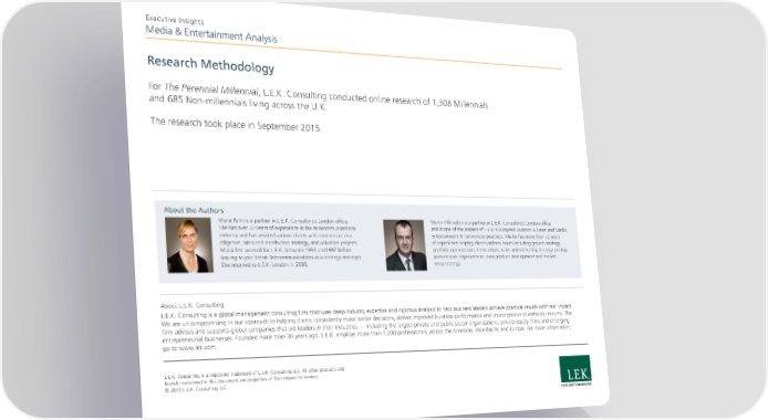Executive Insights Media & Entertainment Analysis Research Methodology For The Perennial Millennial, L.E.K. Consulting conducted online research of 1,308 Millennials and 685 Non-millennials living across the U.K. The research took place in September 2015. About the Authors Maria Palm is a partner in L.E.K. Consulting’s London office. Martin Pilkington is a partner in L.E.K. Consulting’s London office She has over 22 years of experience in the telecommunications and is one of the leaders of L.E.K.’s European Aviation & Travel and Media, industry and has assisted various clients with commercial due Entertainment & Technology practices. Martin has more than 22 years diligence, sales and distribution strategy, and valuation projects. of experience helping clients address issues including growth strategy, Maria first worked for L.E.K. between 1993 and1997 before portfolio optimization, transactions, sales and marketing strategy, pricing, leaving to join British Telecommunications as a strategy manager. performance improvement, new product development and market She returned to L.E.K. London in 2000. entry strategy. About L.E.K. Consulting L.E.K. Consulting is a global management consulting firm that uses deep industry expertise and rigorous analysis to help business leaders achieve practical results with real impact. We are uncompromising in our approach to helping clients consistently make better decisions, deliver improved business performance and create greater shareholder returns. The firm advises and supports global companies that are leaders in their industries — including the largest private and public sector organizations, private equity firms and emerging entrepreneurial businesses. Founded more than 30 years ago, L.E.K. employs more than 1,200 professionals across the Americas, Asia-Pacific and Europe. For more information, go to www.lek.com. L.E.K. Consulting is a registered trademark of L.E.K. Consulting LLC. All other products and brands mentioned in this document are properties of their respective owners. © 2016 L.E.K. Consulting LLC