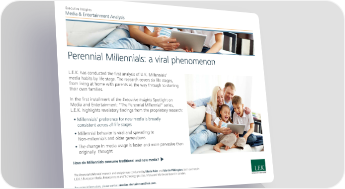 Executive Insights Media & Entertainment Analysis Perennial Millennials: a viral phenomenon L.E.K. has conducted the first analysis of U.K. Millennials’ media habits by life stage. The research covers six life stages, from living at home with parents all the way through to starting their own families. In the first installment of the Executive Insights Spotlight on Media and Entertainment: “The Perennial Millennial” series, L.E.K. highlights revelatory findings from the proprietary research: • Millennials’ preference for new media is broadly consistent across all life stages • Millennial behavior is viral and spreading to Non-millennials and older generations • The change in media usage is faster and more pervasive than originally thought How do Millennials consume traditional and new media? t The Perennial Millennial research and analysis was conducted by Maria Palm and Martin Pilkington, both partners in L.E.K.’s European Media, Entertainment and Technology practice. Maria and Martin are based in London. For more information, please contact [email protected].