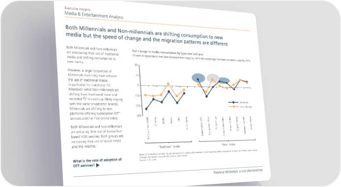 Executive Insights Media & Entertainment Analysis Both Millennials and Non-millennials are shifting consumption to new media but the speed of change and the migration patterns are different Both Millennials and Non-millennials Net change in media consumption by type over last year are decreasing their use of traditional Percent of respondents that have increased their usage by >10% less percentage that have decreased usage by >10% media and shifting consumption to new media. 20 However, a larger proportion of Millennials state they have reduced 10 the use of traditional media, in particular for traditional TV. 0 Moreover, while Non-millennials are shifting from traditional linear and (10) recorded TV to catch-up (likely staying Millennials with the same broadcaster brands), (20) Non-millennials Millennials are shifting to new platforms offering subscription OTT (30) services and / or free online video. net ded) DVDs Radio CDs Both Millennials and Non-millennials ecor Cinema are reducing their use of transaction- Print media TV catch-up Music onlineDigital mediaSocial media based VOD services. Both groups are ransaction VODee online video General inter TV (live / r Subscription OTTT Fr increasing their use of social media and the internet. “New” media “Traditional” media Note: Q: Compared to last year, has your personal (not including other members of your household) weekly consumption (in hours) for different types of media What is the rate of adoption of increased, decreased or remained the same as current levels? Source: L.E.K. survey OTT services? t Perennial Millennials: a viral phenomemon